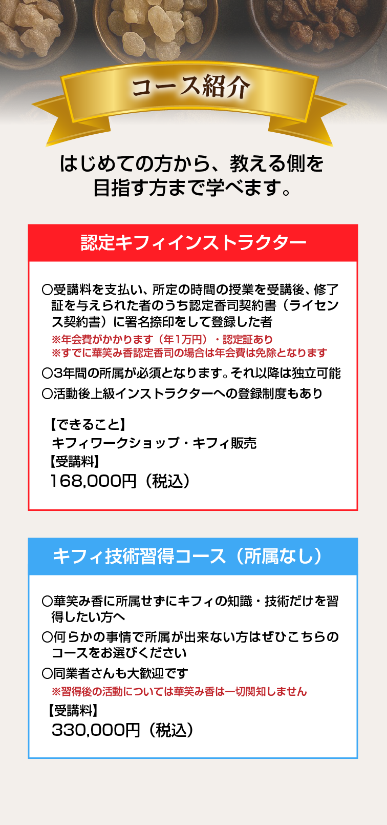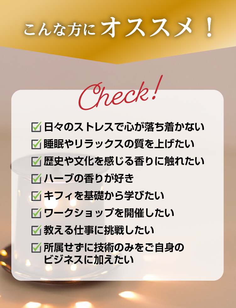 はい、もちろん大丈夫です。 香りやお香づくりの経験がない方でも、一から丁寧に学べるようにカリキュラムを組んでいます。※最初にキフィワークショップを受講してもらうことが条件です