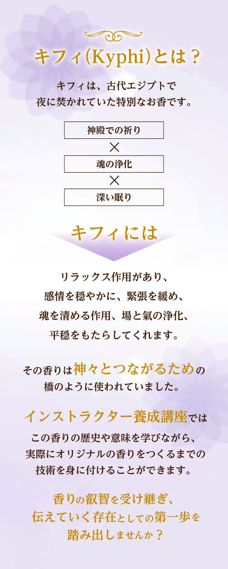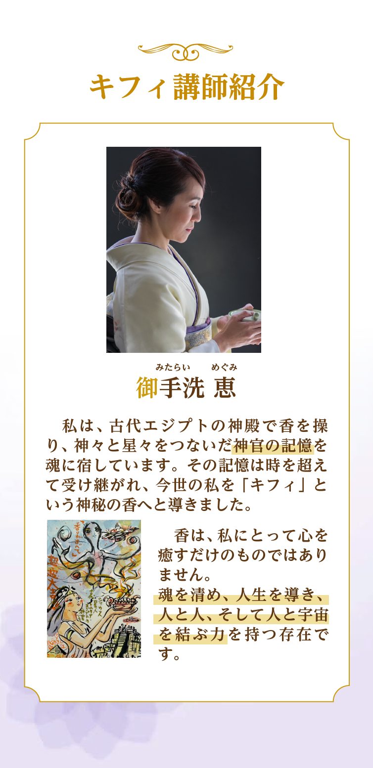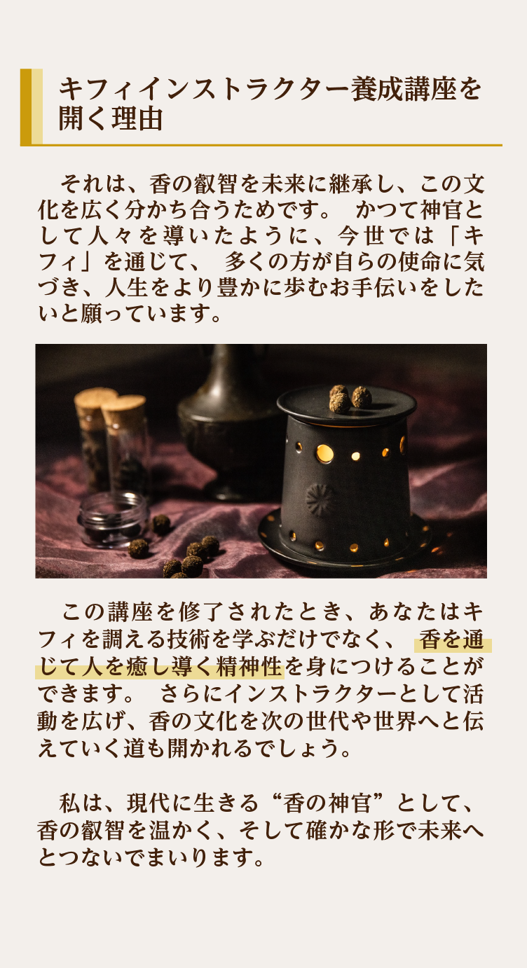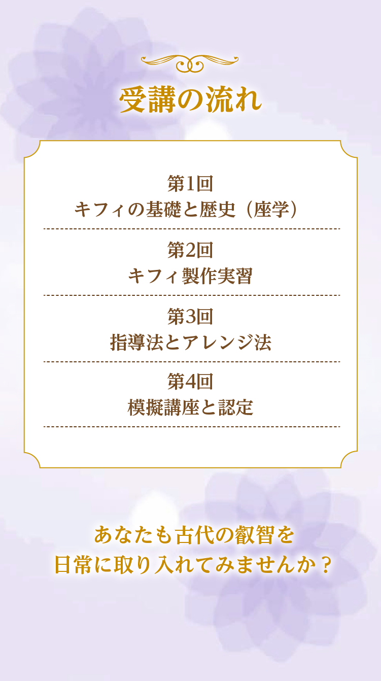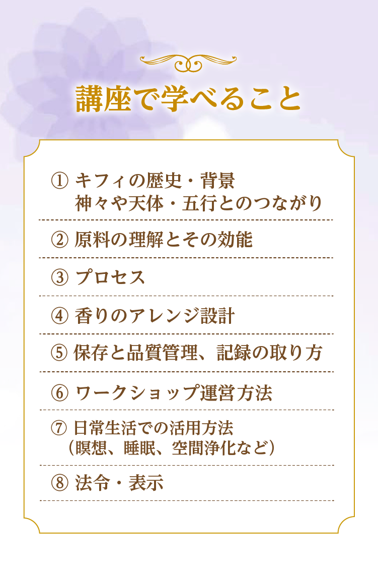 古代エジプトの神秘の香「キフィ」の歴史や意味、材料の扱い方から調合の技術まで学んでいただきます。 また、インストラクターとして活動するための知識や伝え方も含まれています。