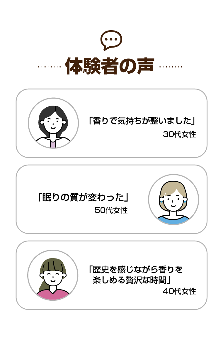 天然の香材を使用しますが、ご心配な方は事前にご相談ください。 できる限りの配慮をさせていただきます。
